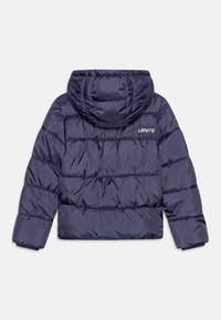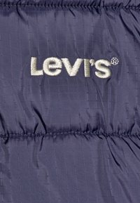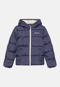 Veste matelassée bleu marine avec capuche, fermeture éclair blanche, deux poches avant et logo "Levi's" sur la poitrine gauche.