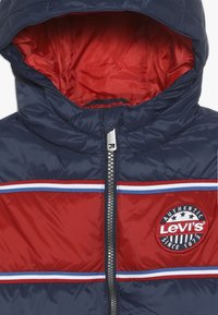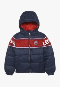 Doudoune bleu marine et rouge avec capuche, fermeture éclair frontale, poches latérales, et logo Levi's sur la poitrine et les manches.