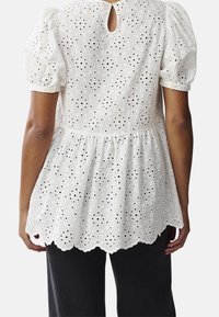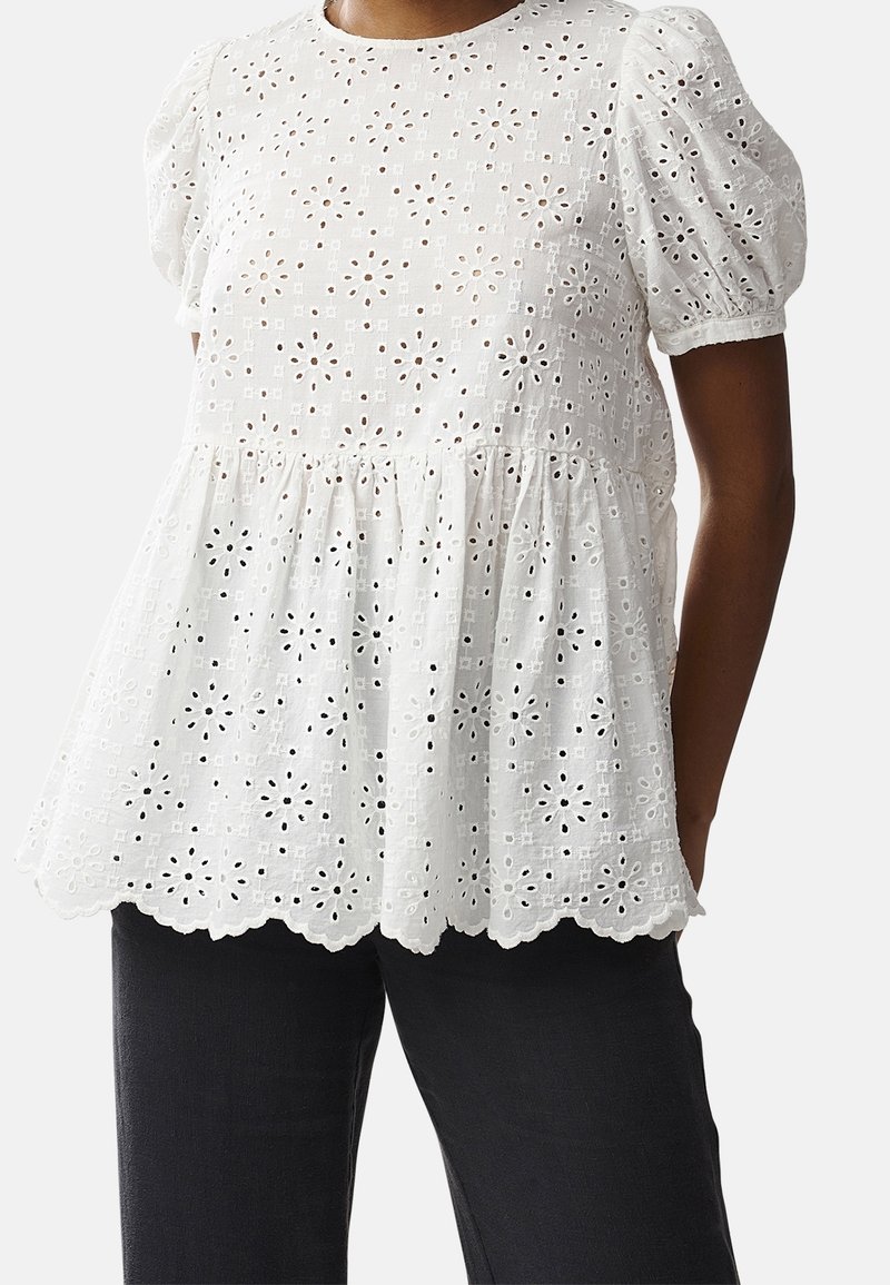 Blouse blanche en broderie anglaise avec manches bouffantes, col rond et ourlet festonné. Présente des découpes florales, un corsage froncé et un tissu léger.
