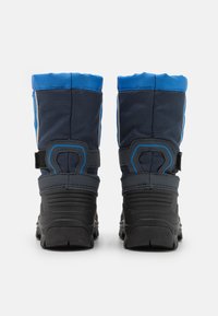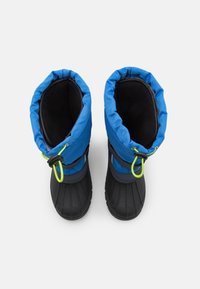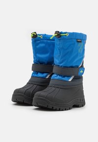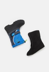 Botte de neige isolante bleue et noire avec une tige imperméable, une semelle en caoutchouc, un col ajustable et une sangle à scratch pour un ajustement sûr.