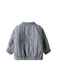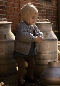 Tout-petit portant un bonnet en tricot beige avec des motifs d'oiseaux et une veste matelassée bleu clair avec une baleine brodée dans le dos, vu de dos en extérieur.