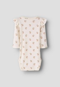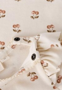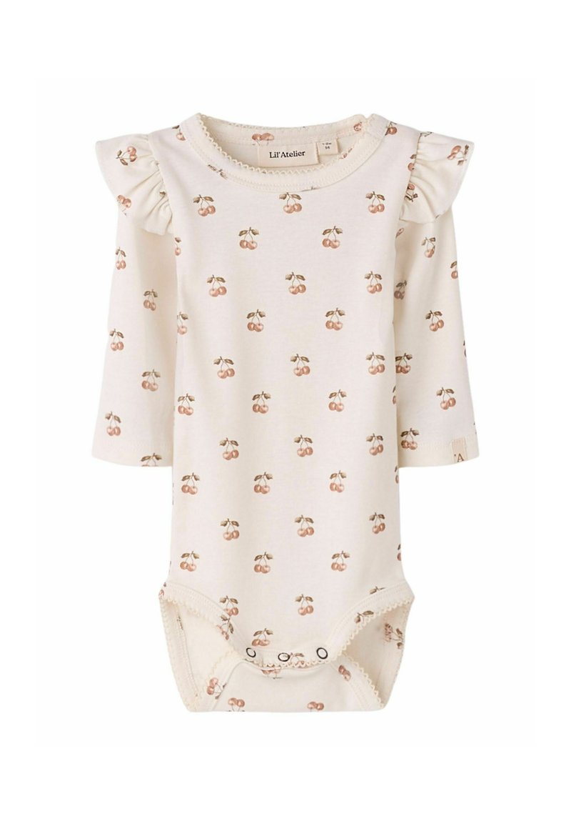 Body manches longues pour bébé de couleur crème avec des épaules à volants et un imprimé de petites cerises roses sur toute la surface, fermeture pressionnée au bas.