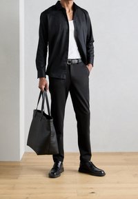 Homme portant un pantalon noir ajusté avec poches zippées, une chemise noire et des mocassins en cuir noir à pampilles, debout les mains dans les poches.