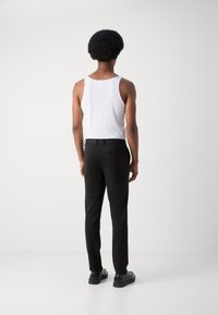 Pantalons navy à coupe slim, texture lisse et devant plat. Portés avec des baskets blanches, complétés par un t-shirt blanc uni et une veste sombre.