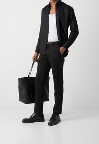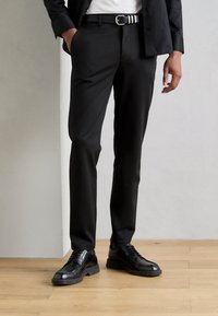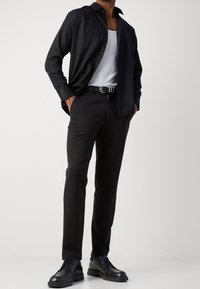 Pantalons noirs ajustés en tissu lisse, associés à une ceinture noire texturée et des chaussures en cuir noir à lacets, sur un sol en bois.