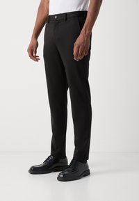 Pantalons noirs ajustés avec une coupe slim, présentant une texture lisse et des poches latérales, associés à des mocassins noirs avec des accents en matériel doré.