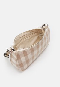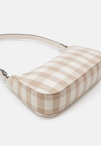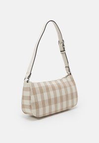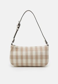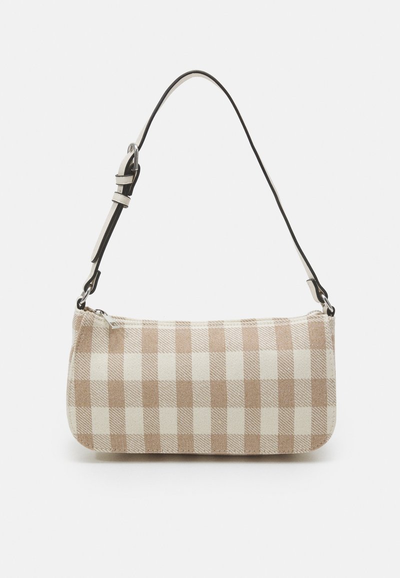 Petit sac à main en tissu à carreaux beige et blanc, avec une bandoulière noire ajustable et une fermeture éclair argentée.