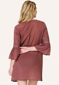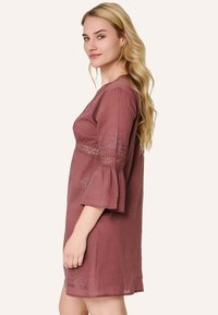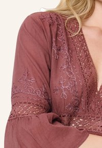 Femme aux longs cheveux blonds portant une robe mauve à col en V avec des détails en dentelle et des manches trois-quarts évasées, debout devant un fond clair.