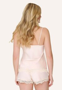 Femme souriante aux longs cheveux blonds portant un caraco rose pâle orné de dentelle et un short assorti, debout devant un fond clair.