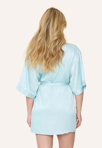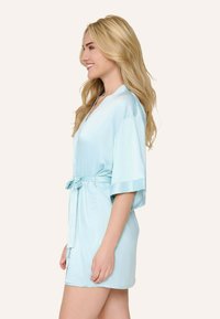 Robe en satin bleu clair avec des manches kimono courtes, un modèle croisé et une ceinture nouée. Texture lisse sans motifs ni éléments métalliques visibles.