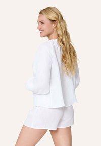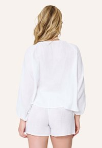 Femme blonde souriante, portant un chemisier blanc ample avec trois liens sur le devant et un short blanc assorti, sur fond uni.