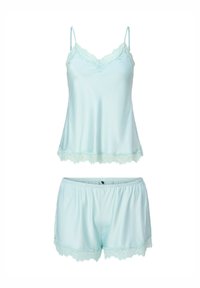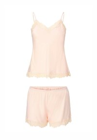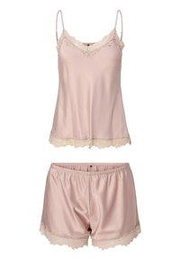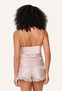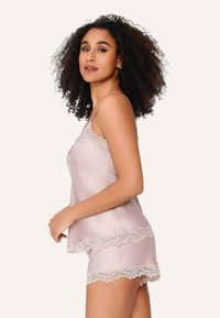 Femme aux cheveux bouclés portant un caraco en satin rose clair et un short assorti avec bordure en dentelle, debout devant un fond uni.