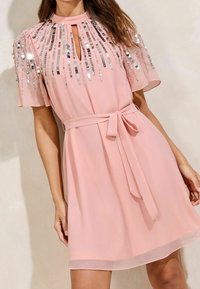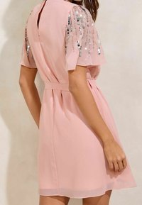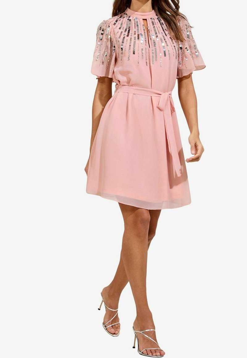 Robe courte rose avec des manches bouffantes, ornée de sequins sur le buste, et une taille ceinturée pour un look ajusté. Associée à des sandales argentées à talons hauts.