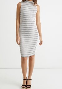 Robe sans manches ajustée en tissu blanc texturé avec des rayures horizontales bleu marine, présentant un col haut et une silhouette longueur genou.