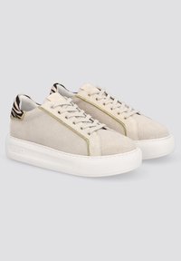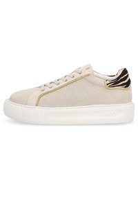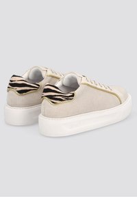 Baskets beiges à surface texturée, accents dorés et détails rayés noirs et blancs sur le talon, posées sur une semelle blanche.