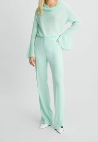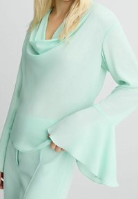 Femme portant une tenue vert menthe clair avec de longues manches cloche et un col bénitier drapé, associée à un pantalon sur mesure assorti.