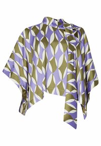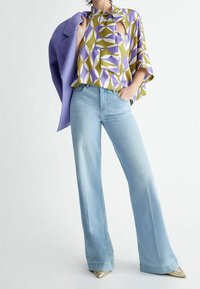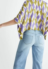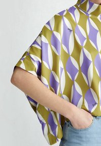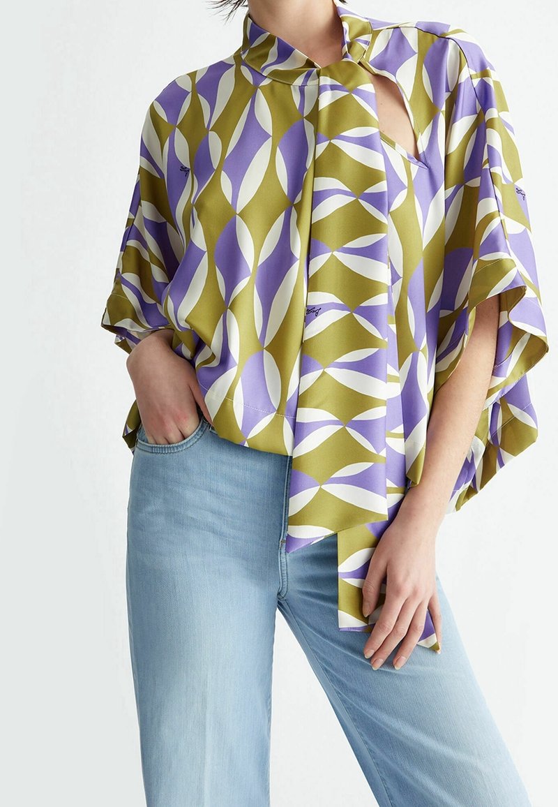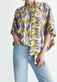 Femme portant un chemisier ample avec un motif abstrait de feuilles en vert olive, lavande et blanc, associé à un jean bleu clair, main dans la poche.