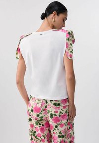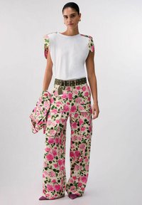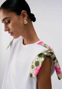 Femme aux cheveux foncés portant un haut blanc avec des épaules matelassées à motifs floraux et un pantalon taille haute assorti avec des fleurs roses et vertes.