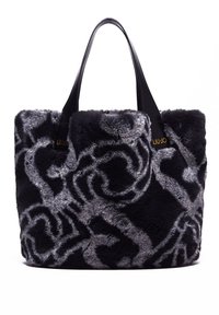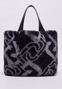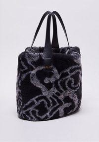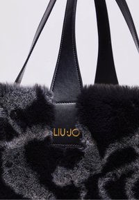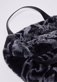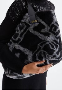 Personne portant un pull noir à sequins tient un grand sac à main Liu Jo en fausse fourrure noire et grise à motifs, avec une lanière en cuir.