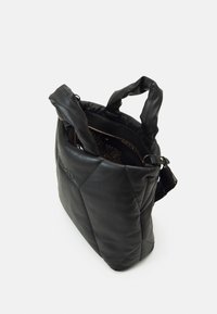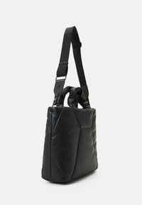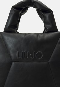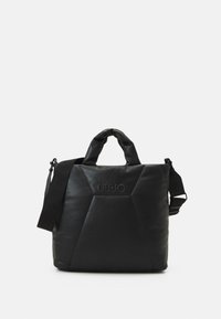 Sac cabas carré noir matelassé avec anses courtes, bandoulière réglable et logo "LIU JO" embossé à l'avant.