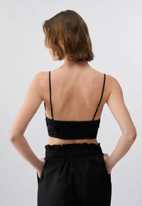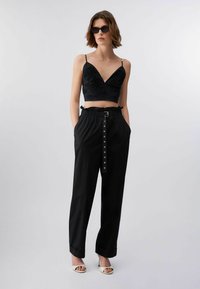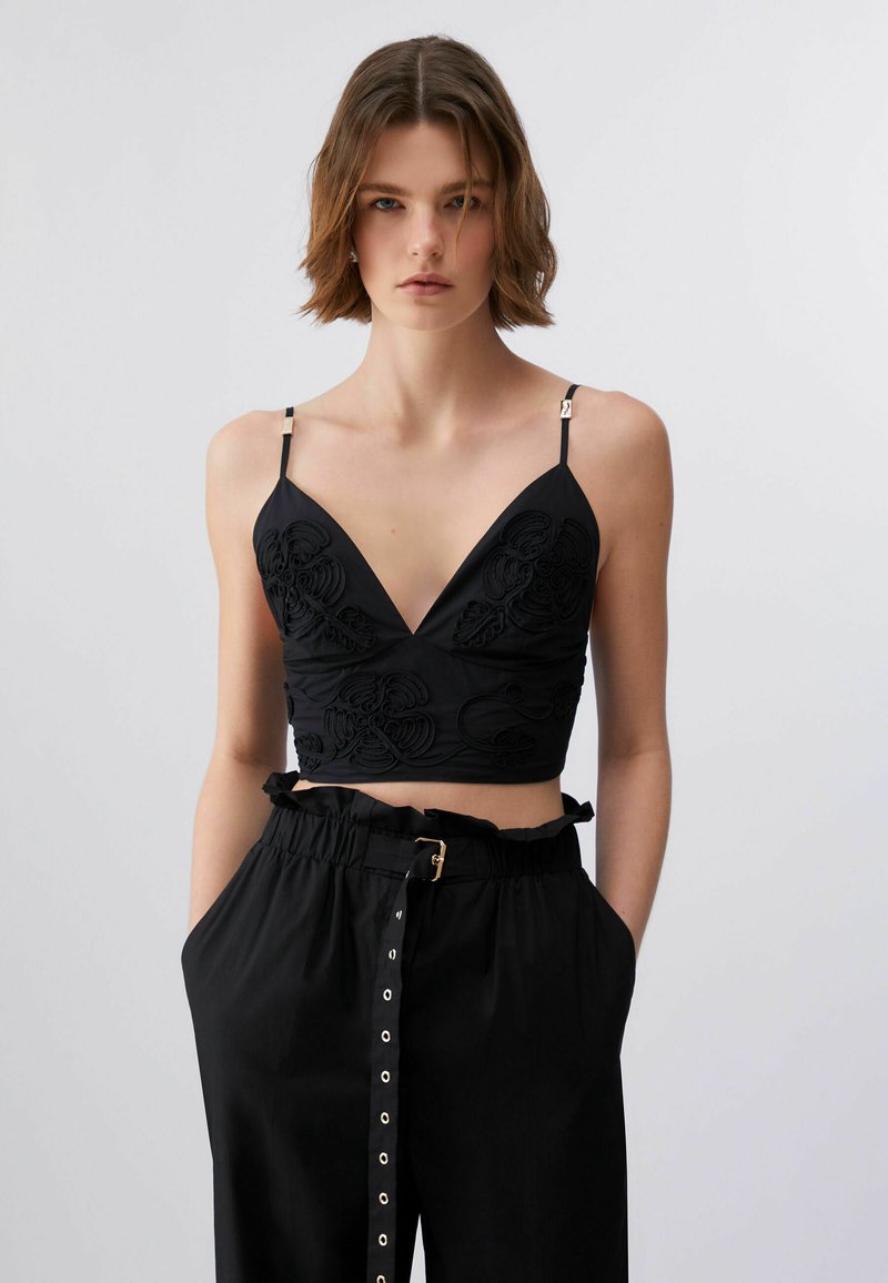 Jeune femme aux cheveux bruns courts portant un crop top noir brodé avec des bretelles fines et un pantalon noir taille haute avec une ceinture.