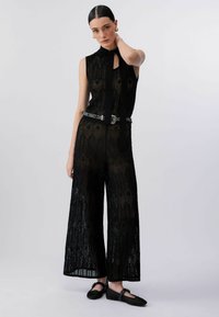 Femme aux cheveux coiffés en arrière porte un haut sans manches en dentelle noire avec cravate et un pantalon large assorti, accessoirisés de boucles d'oreilles et bracelets dorés.