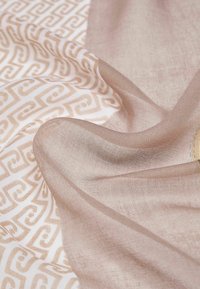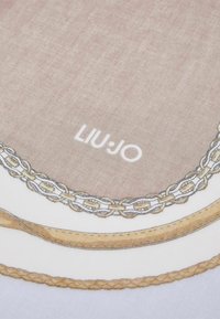 Écharpe bleu clair et beige avec motifs de chaînes et de cordes, logo "LIU·JO" et bords frangés, pliée en boucle.