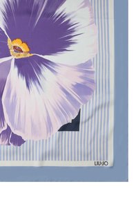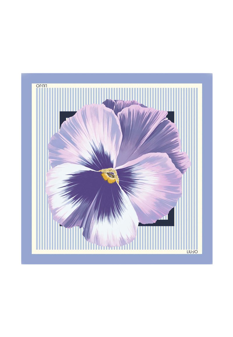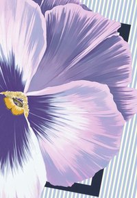 Grande fleur de pensée avec des pétales violets, lilas et blancs, centrée sur un fond carré rayé bleu et blanc avec une bordure bleue.