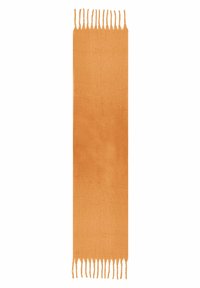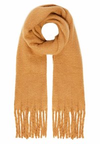 Personne portant un manteau marron texturé avec une grande écharpe beige douce enroulée autour du cou, avec des franges pendantes sur un côté.