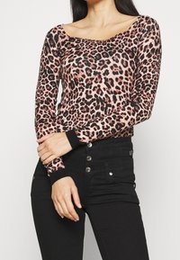 Top à manches longues en imprimé léopard rose et noir, avec un large décolleté et des poignets en rib à rayures noires. Associé à un jean noir à boutons.