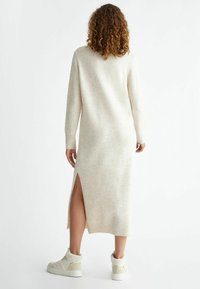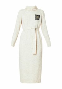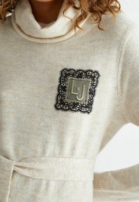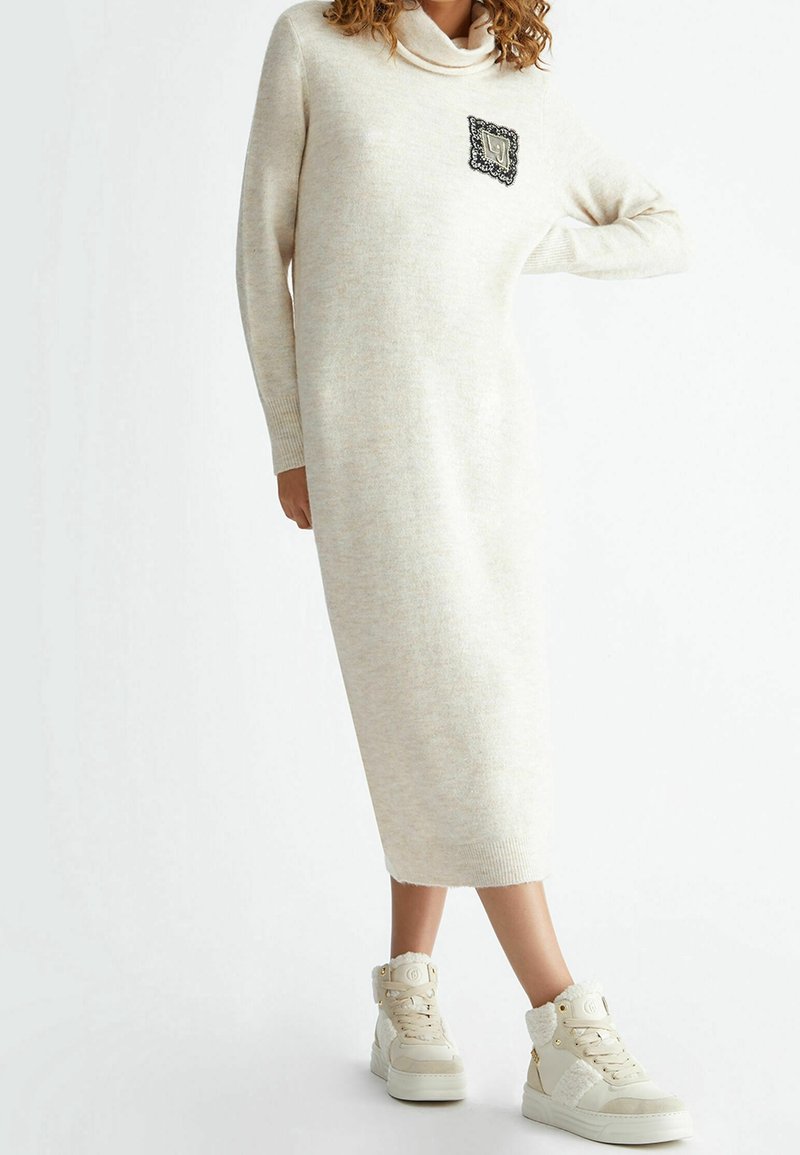 Robe en tricot beige à col roulé avec manches longues et un patch décoratif noir. Associée à des baskets montantes blanches ornées de bordure en fourrure.