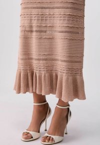 Jupe tricotée beige longueur genou avec des rayures texturées horizontales et un ourlet à volants, portée avec des sandales à talons blancs à bride cheville.