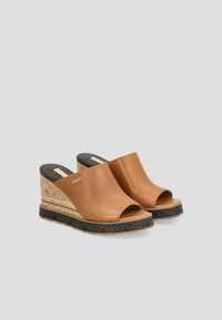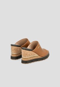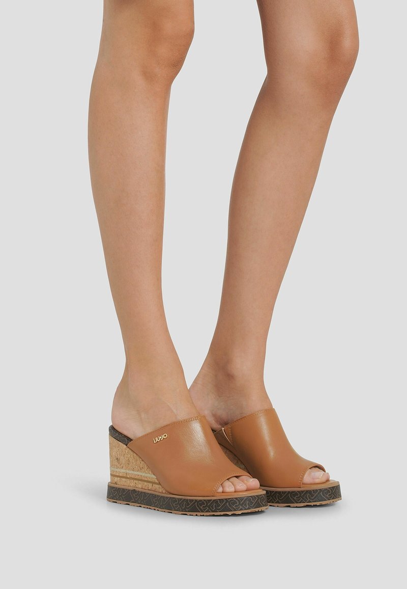 Sandales compensées en cuir brun avec un talon en liège, design à bout ouvert et semelle texturée noire avec un motif.
