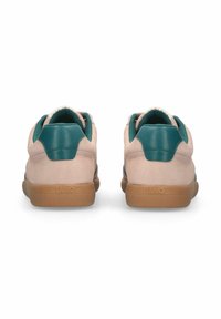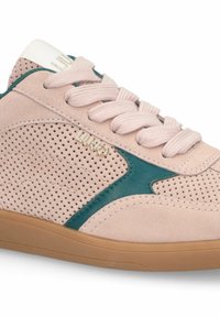 Baskets en daim rose avec un accent en cuir verni beige, bout rond, fermeture à lacets, et une semelle plateforme blanche. Présente des coutures décoratives.