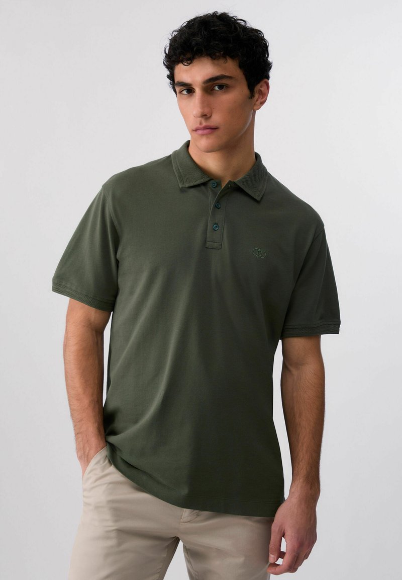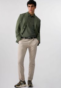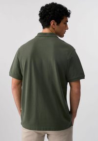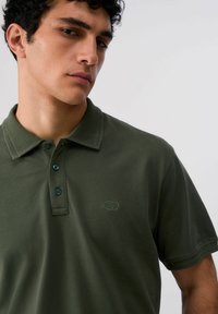 Jeune homme aux cheveux noirs bouclés portant un polo à manches courtes vert olive et un pantalon beige, debout avec une main dans la poche.