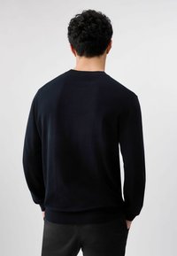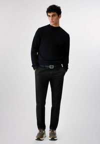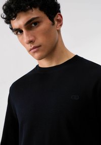 Homme aux cheveux bouclés portant un pull noir uni à manches longues et un pantalon sombre, regardant vers le bas à sa gauche sur un fond neutre.