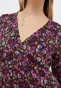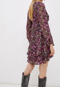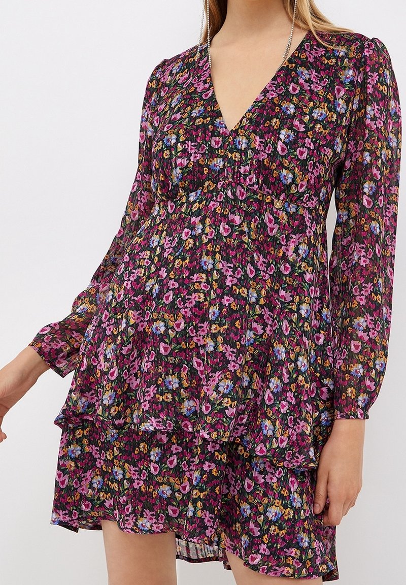 Robe florale avec un décolleté en V profond, des manches longues et des volants superposés. Le motif comprend des fleurs roses, bleues et jaunes sur un fond noir.