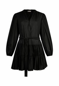 Robe courte en mousseline de coton Col en V avec boutons recouverts Col orné de clous appliqués Manches bouffantes sur les épaules Empiècement plissé à l'ourlet Ceinture ton sur ton
