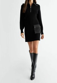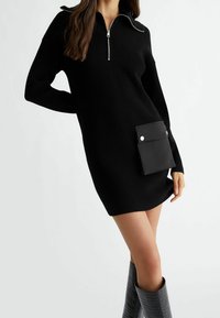 Robe en tricot noir avec un col zippé, dotée d'une poche latérale avec fermeture à pression. Texture lisse et silhouette ajustée.