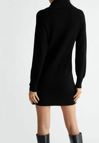 Robe noire en maille avec un col montant, des manches longues bouffantes et des poignets côtelés. L'ourlet est au-dessus du genou et présente une texture lisse.