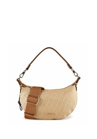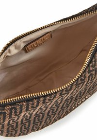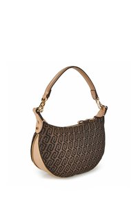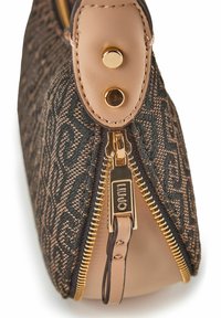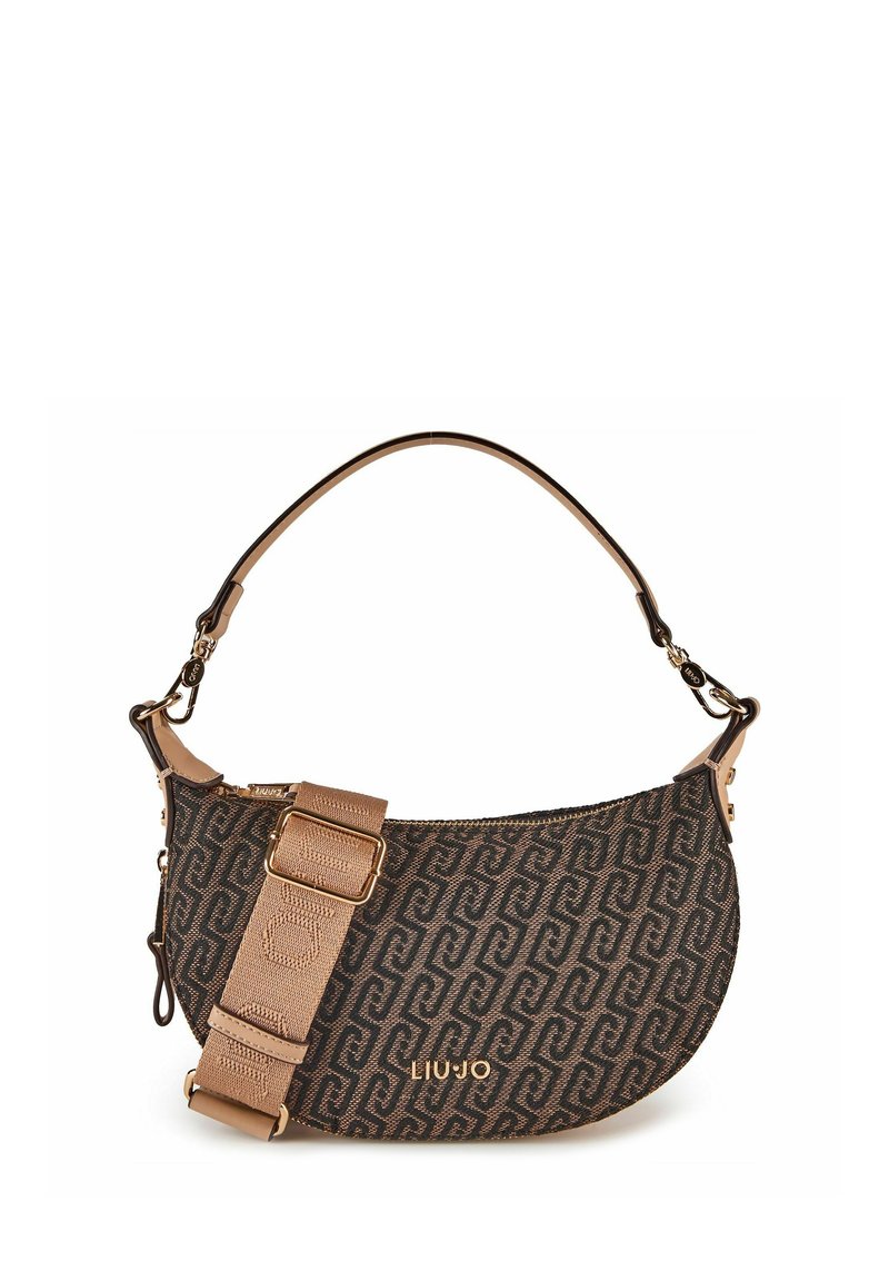 Sac à main croissant Liu Jo marron et noir à motif, avec bandoulière large détachable, boucle dorée et détails du logo.