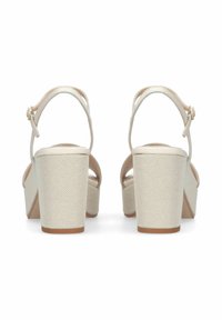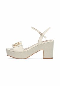 Sandale à plateforme beige avec talon bloc, bride à la cheville, boucle dorée sur la bride avant, semelle texturée, vue de profil sur fond blanc.