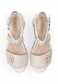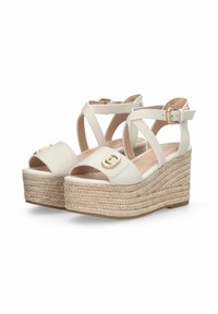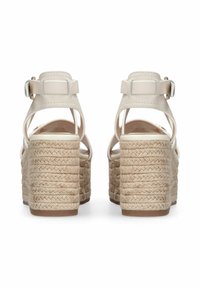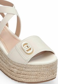 Sandale compensée beige avec plateforme en jute tressé, bride à la cheville, boucle dorée et bride avant ornée d’un élément décoratif doré.