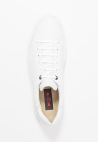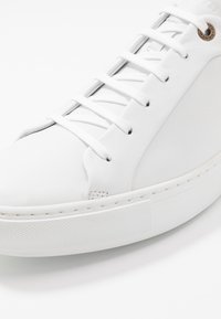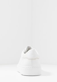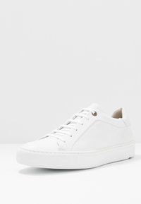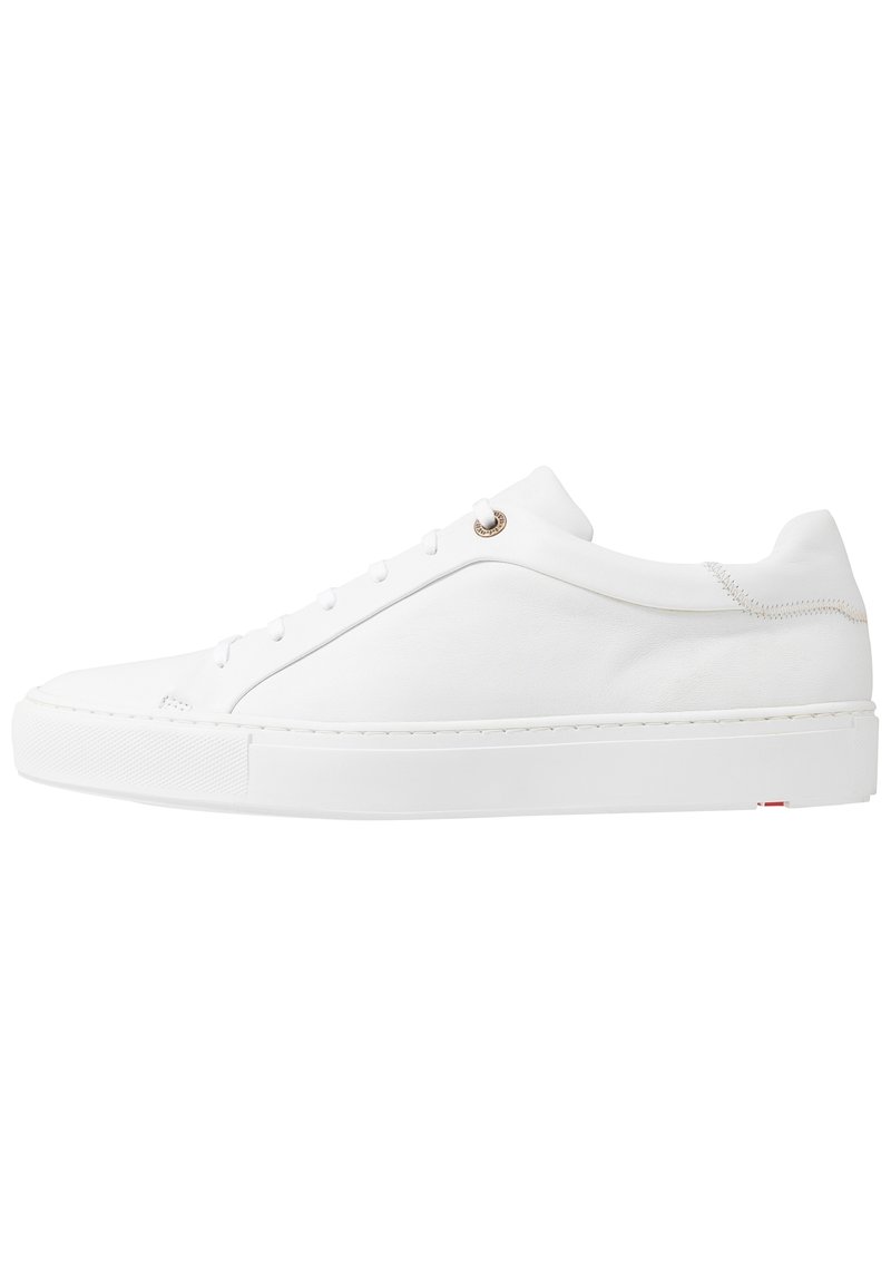 Baskets basses en cuir blanc avec lacets blancs, semelle en caoutchouc épaisse et détails de couture minimalistes le long du talon et du panneau latéral.