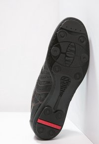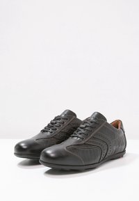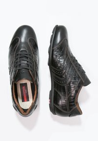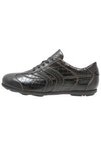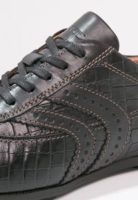 Basket en cuir noir avec texture crocodile, motifs décoratifs perforés, coutures marron et semelle noire avec accent rouge.