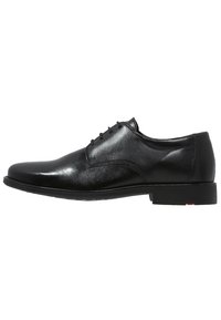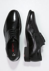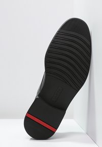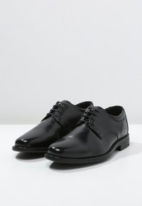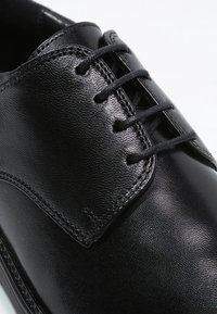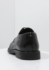 Chaussure habillée en cuir noir avec une finition lisse, bout arrondi, laçage à cinq œillets et semelle en caoutchouc texturé et basse. Design minimaliste.