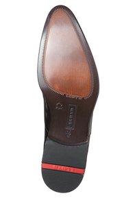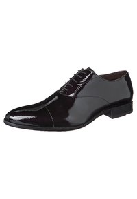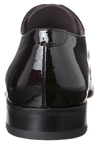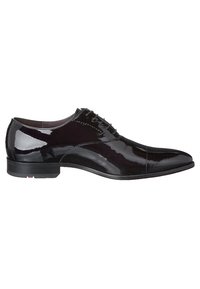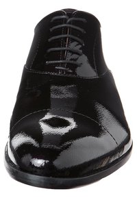Chaussure habillée en cuir verni noir avec un bout pointu, un design à lacets, un panneau texturé et une finition lisse. Présente un talon bas et une silhouette épurée.