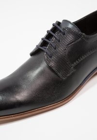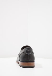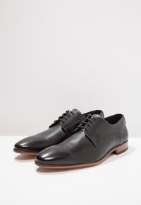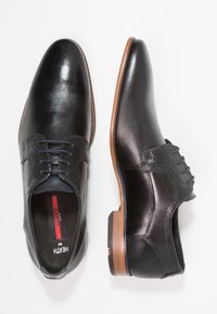 Chaussure de ville en cuir noir avec une finition lisse, panneau latéral texturé, forme étroite, design à lacets, et semelle en bois avec une couleur d'accent.