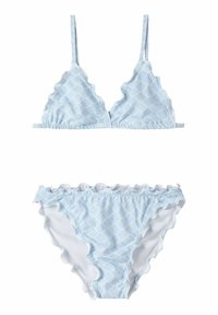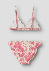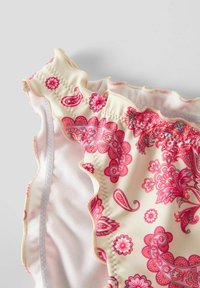 Bikini en deux pièces avec motifs cachemire roses et floraux sur tissu blanc, avec bords festonnés en haut et en bas.