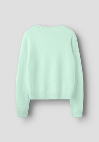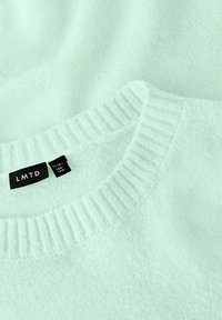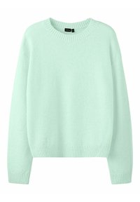 Pull col rond vert menthe clair avec manches longues et poignets, ourlet et encolure côtelés, fabriqué en tissu doux et texturé.
